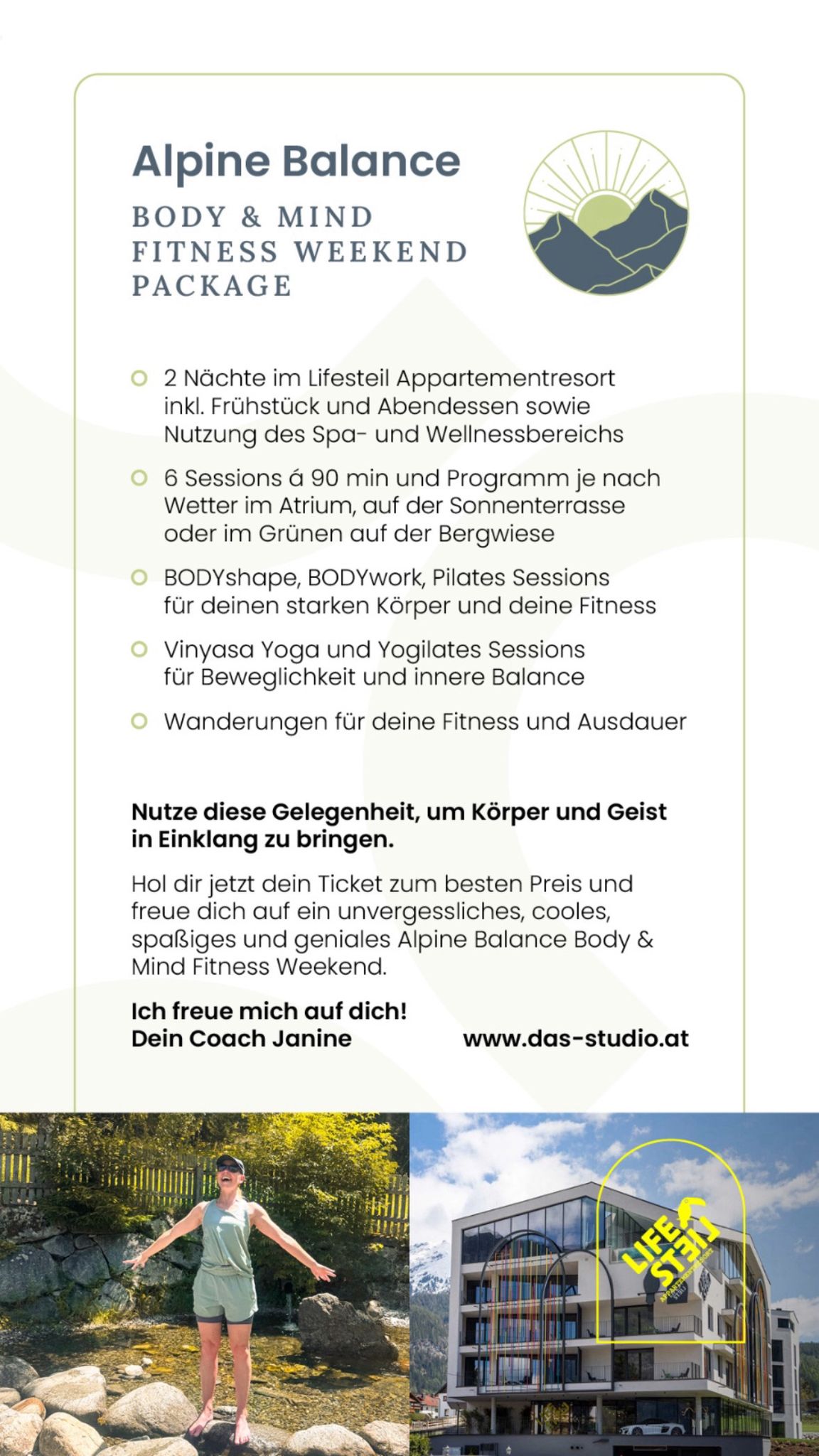 Das LIFESTEIL APPARTEMENTRESORT liegt inmitten der traumhaften Ötztaler Bergkulisse. Lass uns gemeinsam 3 wunderbare Tage in Umhausen mit unserem einzigartigen BODY & MIND Fitnessprogramm verbringen und genießen.